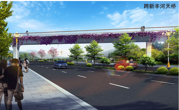 4、连接滨河公园及滨河西路的跨新丰河天桥1座,单跨跨度约65米。